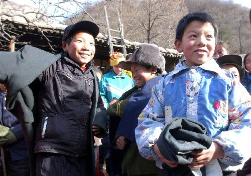 12月11日,河北省平山县北冶乡恶石村的几个孩子试穿热心人捐赠的冬衣。当日,河北省石家庄市“送温暖、献爱心大型社会帮扶行动”在太行山区的平山县北冶乡举行。来自石家庄市的200多个家庭的430多人为老区贫困群众送来了衣物、被褥等捐赠物品。