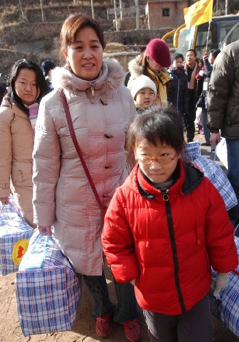 12月11日,一名小女孩(前)在妈妈的带领下来到河北省平山县北冶乡恶石村参加送温暖活动。当日,河北省石家庄市“送温暖、献爱心大型社会帮扶行动”在太行山区的平山县北冶乡举行。来自石家庄市的200多个家庭的430多人为老区贫困群众送来了衣物、被褥等捐赠物品,受到山区村民们的欢迎。