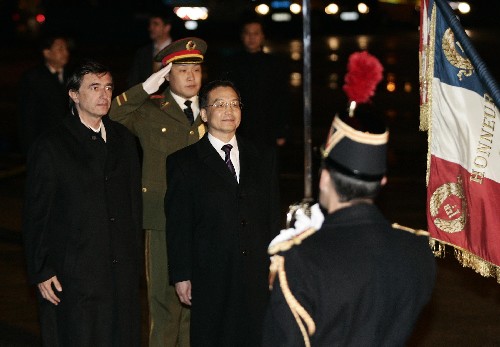 当地时间17时50分,温家宝总理乘坐的专机抵达夜色中的巴黎奥利机场。法国政府在机场举行了欢迎仪式。中法两国国旗高高飘扬,中法两国国歌雄壮嘹亮。温家宝检阅了法国共和国卫队。中国驻法国大使馆工作人员、华侨华人、留学生和中资机构的代表在机场热烈欢迎温家宝总理一行。