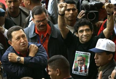 阿根廷前球王马拉多纳和强烈反美的委内瑞拉总统查韦斯在一个反布什的集会上发言,抗议布什出席美洲峰会。