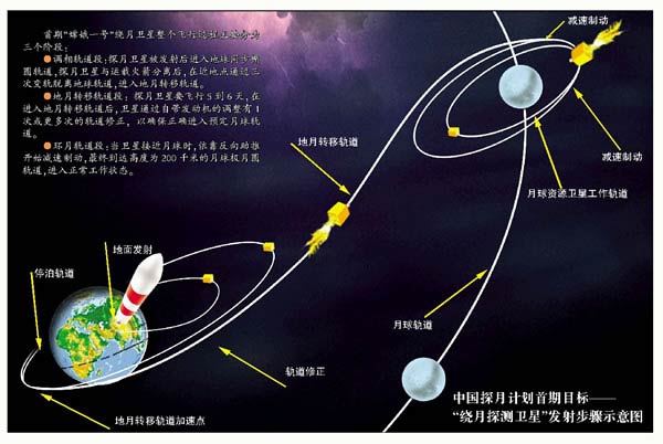 “嫦娥一号”“CE-1”将是我国发射的距离地球最远的探测器,距地球最远距离超过40万公里。“CE-1”将首先由火箭发射,成为绕地飞行的地球卫星(不是同步卫星),然后再依靠自身发动机多次加速,使其脱离地球轨道进入地月转移轨道。到达近月点时,探测器又必须依靠自身发动机反向制动使其减速,最终被月球俘获,成为月球卫星。