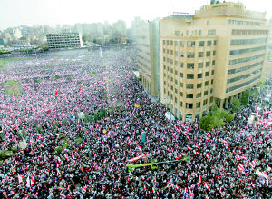 在叙利亚宣布从黎巴嫩撤军后,黎巴嫩真主党8日组织数十万名黎巴嫩人在首都贝鲁特市中心广场举行声势浩大的游行示威活动,谴责美国等国干涉黎巴嫩事务,对受到国际社会压力的叙利亚表示支持。