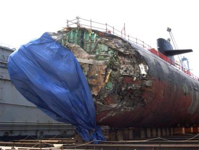 目前“旧金山”号正在关岛阿普拉美海军基地的干船坞内接受损伤调查。美军公布的照片显示,“旧金山”号于1月8日在水下500英尺深度以30节左右的高速撞上海底山后,组成艇首鼻部的声纳罩被撞碎,外壳严重受损。所幸潜艇坚固的内层艇壳顶住了剧烈的冲击,使得艇员居住和工作舱免于受损,潜艇才得以紧急上浮勉强返回关岛。此外,美太平洋舰队发言人指出,由于声纳系统和潜艇前部水柜中注满海水,碰撞对内层艇壳的冲击有所减弱。这次事故造成一名艇员死亡,另有60多人受伤。