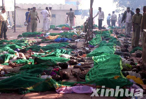 1月25日,踩踏事件遇难者的尸体被陈列在印度西部马哈拉施特拉邦萨塔拉市郊的一座神庙内。当天在当地一座神庙附近举行的一个大型宗教活动上发生了严重踩踏事故。根据来自印度警方的消息,已有300多人在事故中丧生,另有数百人受伤。