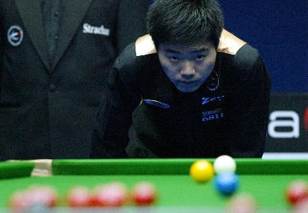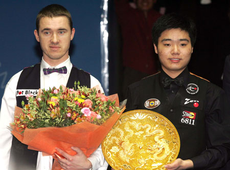 2005年4月3日,“2005年世界职业台球中国公开赛决赛在北京海淀体育馆进行。神童丁俊晖以9比5战胜世界名将亨德利夺得冠军,这是中国选手首次在世界级比赛中折桂。图为丁俊晖(右)亨德利颁奖仪式上。