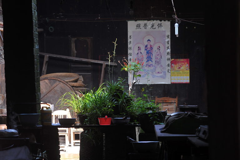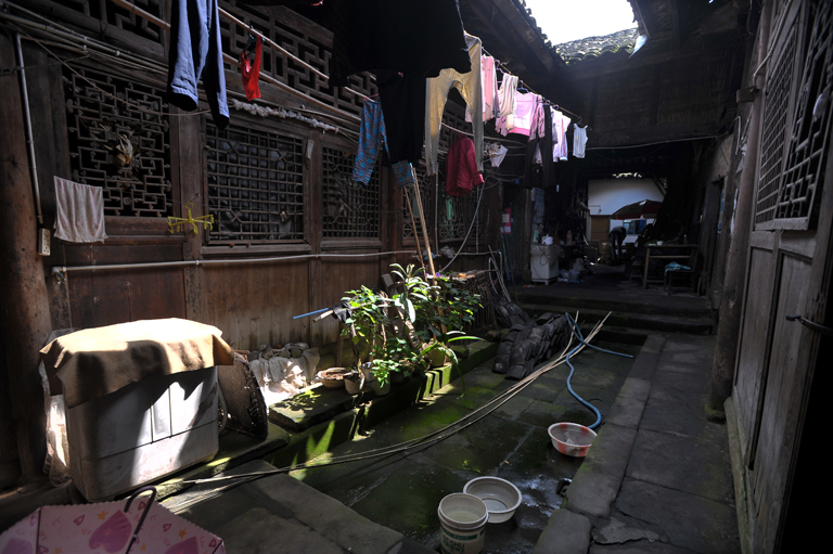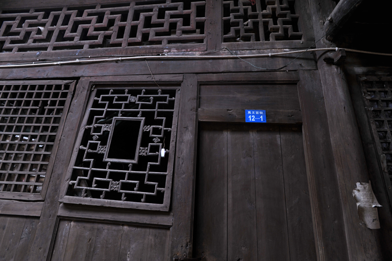 当我们走到一家四合院门口时,一位初中学生模样的小姑娘热情地邀请我们进去看看,还让我们猜猜这座四合院的年龄。“有一百多年了吧”,我说。“嗨,又猜错了,以前来的好多人都猜错了。这房子都是有四百多年了,是我爷爷的爷爷的爷爷他们传下来的。你看那根中间的木头上雕的是啥子?”小姑娘用手指了指正屋房上的中梁问我们。我们顺着她指的方向看上去,梁上隐隐约约地显示出一串长长的雕痕,由于光线较暗,看不太清楚。“那上面雕的是龙”,小姑娘看我们没出声,就直接把答案告诉我们了。除了房梁上有雕饰,老街民居建筑的窗棂皆为方窗,窗雕多数分格类,如意格,什锦嵌花,鸟兽花卉、形神各异。多家窗雕,都是经能工巧匠精心设计,分件雕琢成型后,镶嵌于固定位置,入槽合缝,构成精美浮雕,造型美观,井然有序,堪称川东北民间建筑木雕艺术之精品。