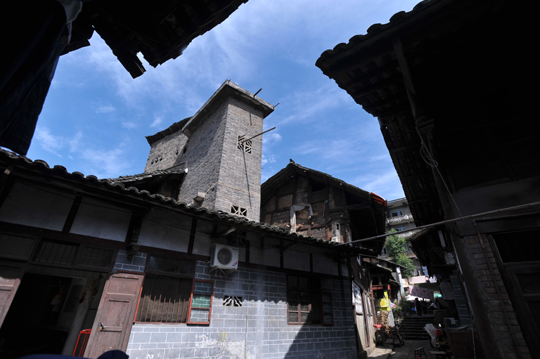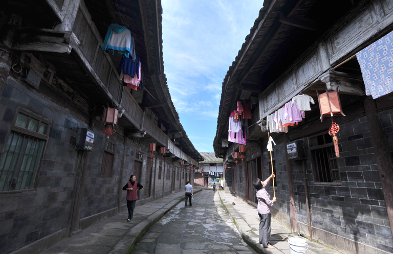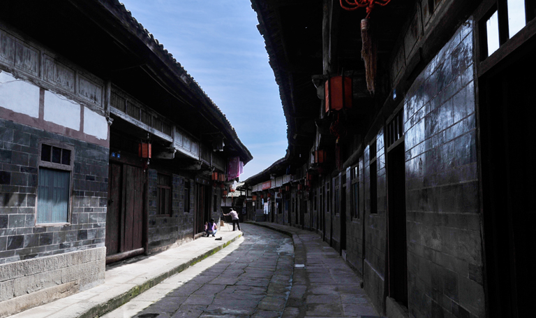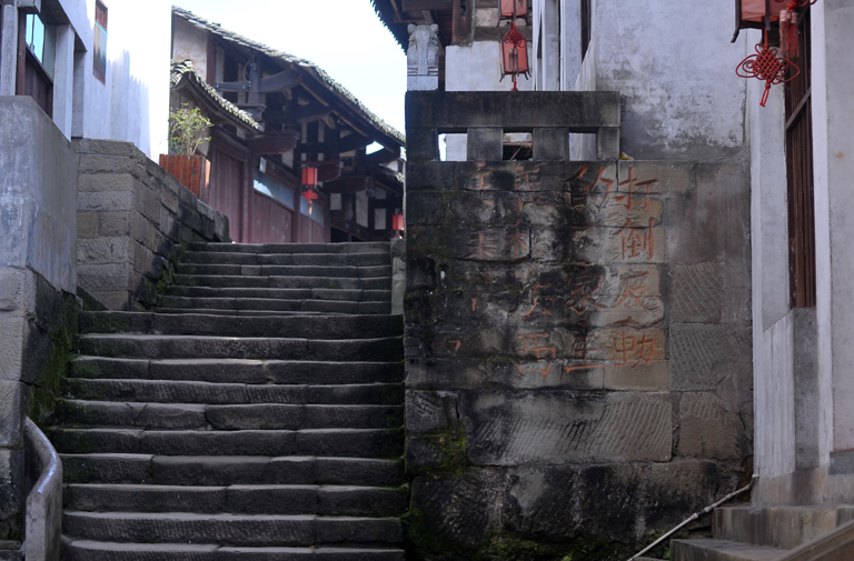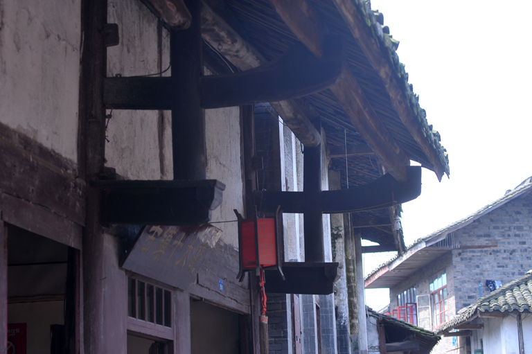 我们走进古镇街道,一下子就体会到它的古朴和历史的久远:大街小巷的路面全是厚实的石板铺成,有些街道的石板已被踩出了深深的路痕;沿街而建的街市民居建筑,多为二进式或三进式小四合院木结构穿斗、木柱檩梁、双檩双挂、青瓦屋面,墙身多用竹篾土夹墙,门面多为可拆卸的木板门,并向外伸出木质骑门柜台,便于经商售货。建筑口面较窄、进深大、内开天井,大户人家则有一进两个小四合院、前院天井、鱼缸,后院花园、假山,书香门第则注重文化氛围的营造。