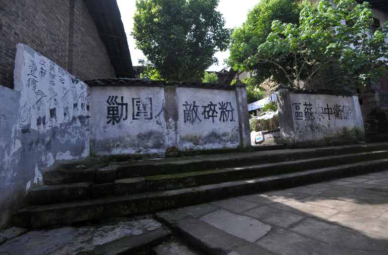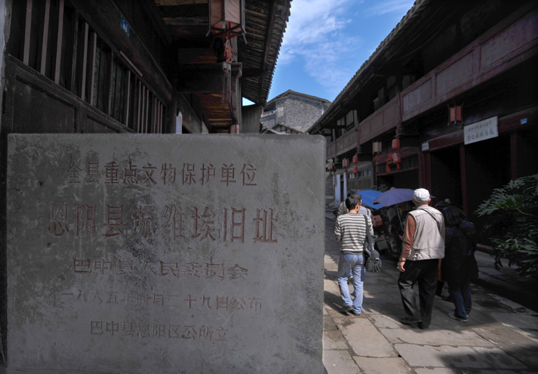 行走在古镇街上,还随处可见当年红军留下的许多标语和新立的纪念石碑:恩阳镇处在全国第二大苏区川陕革命根据地中心地带。1933年,中国工农红军第四方面军反“三路围剿”胜利后,在此设仪阆县苏维埃政府治,后改为“恩阳县苏维埃政府”治。那时的疆域,东起平梁,西至柳林,南到玉山,北达上八庙,辖一镇十区,三十七乡,三百八十一村,人口约三十万余。红军在此建立县苏维埃各类行政机构13处,现保存较为完整的有8处,那些巨幅石标就是川陕革命根据地斗争的历史见证。