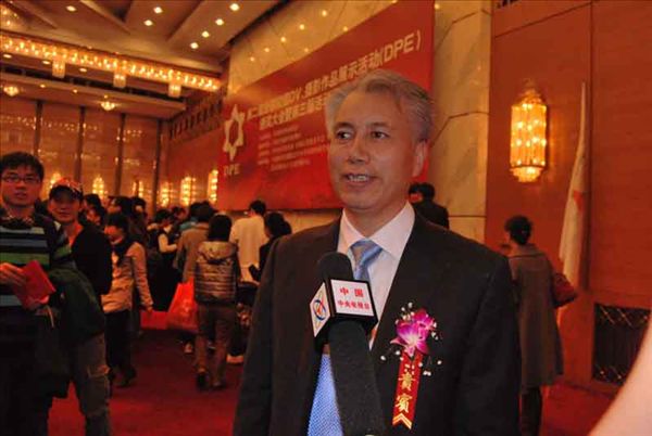西安外事学校院长黄藤在活动现场接收央视记者采访