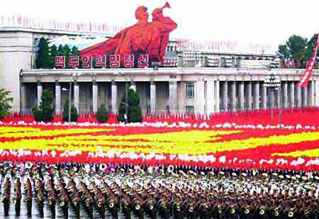 朝鲜人民军海陆空三军今天在平壤市中心的金正日广场举行盛大阅兵式。一百万人参加了群众大游行。朝鲜劳动党总书记、国防委员会委员长、朝鲜人民军最高司令官金正日检阅部队,观看了群众游行。庆祝活动将持续到明天。
