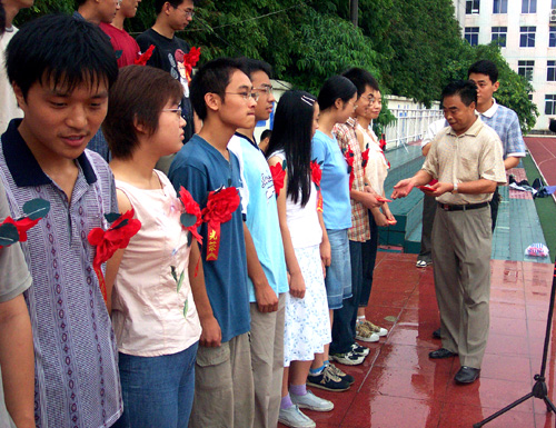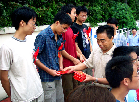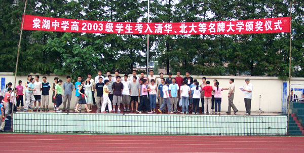 8月6日,雨后的操场空气格外清新,棠湖中学重金奖励2003届考入清华北大等名校的学生的表彰大会在这里隆重举行。棠湖中学校长黄光成亲自为为本校考上清华、北大等名校的高2003级学生颁发了丰厚的奖金。