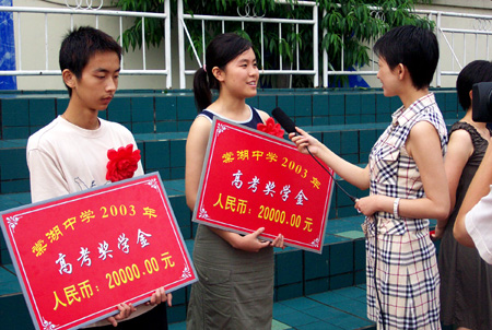 为了奖励高考成绩特别突出的高2003届毕业生,勉励他们在未来的学习中更上层楼,学校决定给予考入清华、北大、复旦大学、南京大学、浙江大学等20所名校的2003级学生陈放、周林路、熊李颖、邹密等颁发了20000至2000元不等的奖学金。