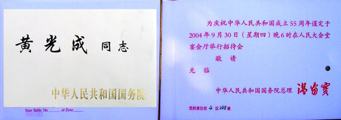 2004年9月30日应中共中央国务院邀请黄光成校长参加庆祝中华人民共和国成立55周年招待会