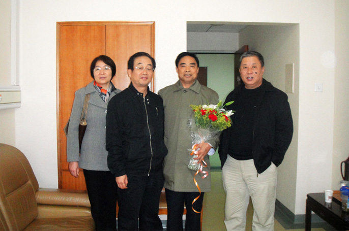 2010年10月中旬,棠外校长黄光成(右二)因长期工作劳累导致旧疾复发,前往北京阜外医院治疗。治疗期间,全国总工会经济技术部部长常毅民(左二)、全国总工会经济技术部劳模管理处处长一行前往医院探视,向他表示了深切的关心和亲切的慰问。 在黄校长回到成都康复期间,省、市、县的相关领导也前往其家中探视,对黄校长及家人表示了亲切的慰问。