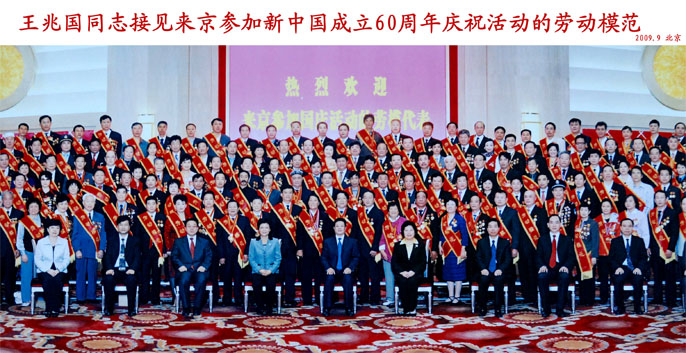 2009年9月29日,王兆国同志接见来京参加新中国成立60周年庆祝活动的劳动模范。棠外校长黄光成(三排右五)