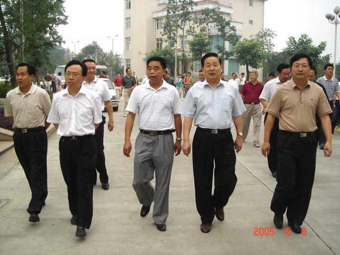 2005年6月8日,四川省人大副主任席义方(右二)在中共双流县委书记谢瑞武(左二)、双流县县长牛敏(右一)的陪同下到棠外进行考察、调研。