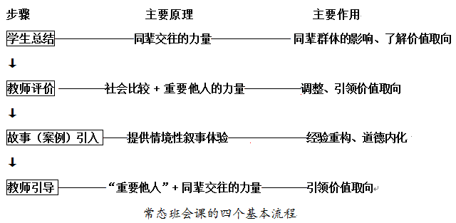 两大核心内容衍生出“常态班会课”的四个基本流程。班主任可根据学段和班级学生差异,在保证两大核心内容落实的前提条件下,对四个流程的时间长短和具体形式,在实施中灵活处置。