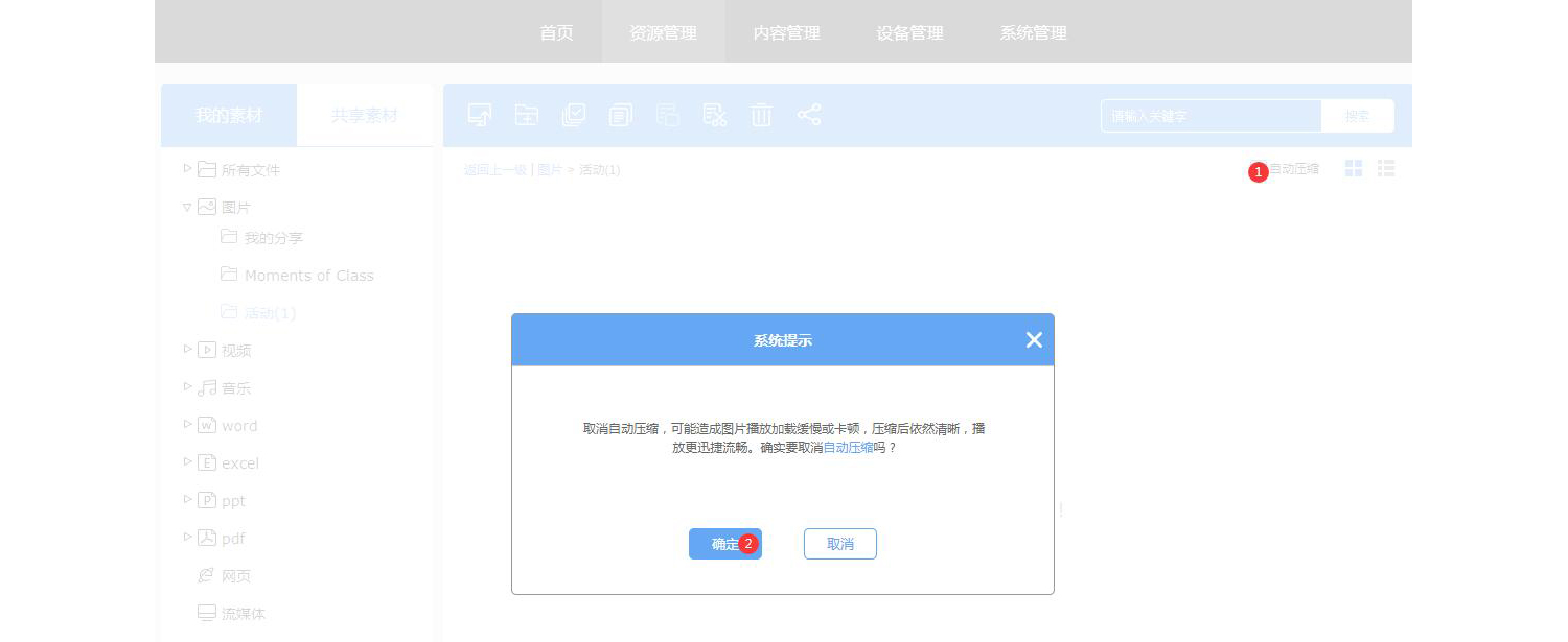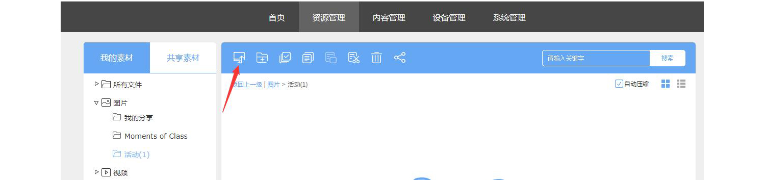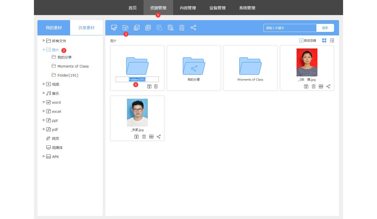 网页登录系统后,点击资源管理-->图片-->新建文件夹,创建图片分类文件夹并重新命名: