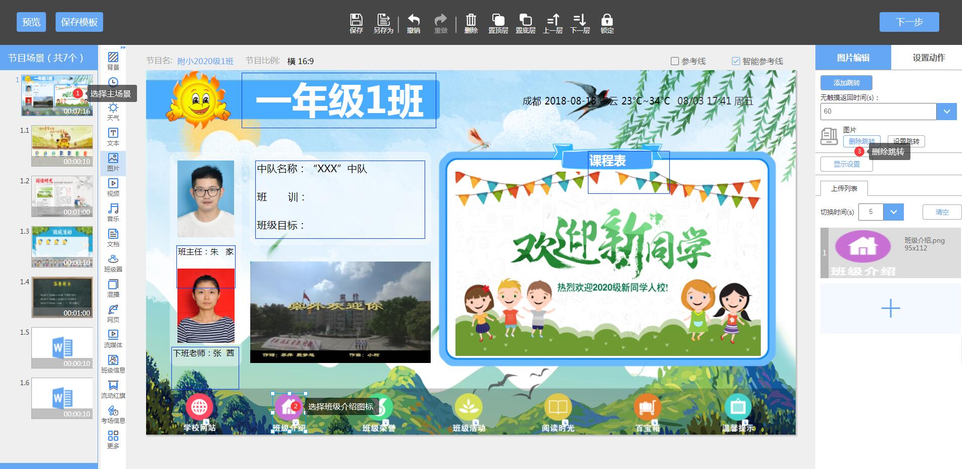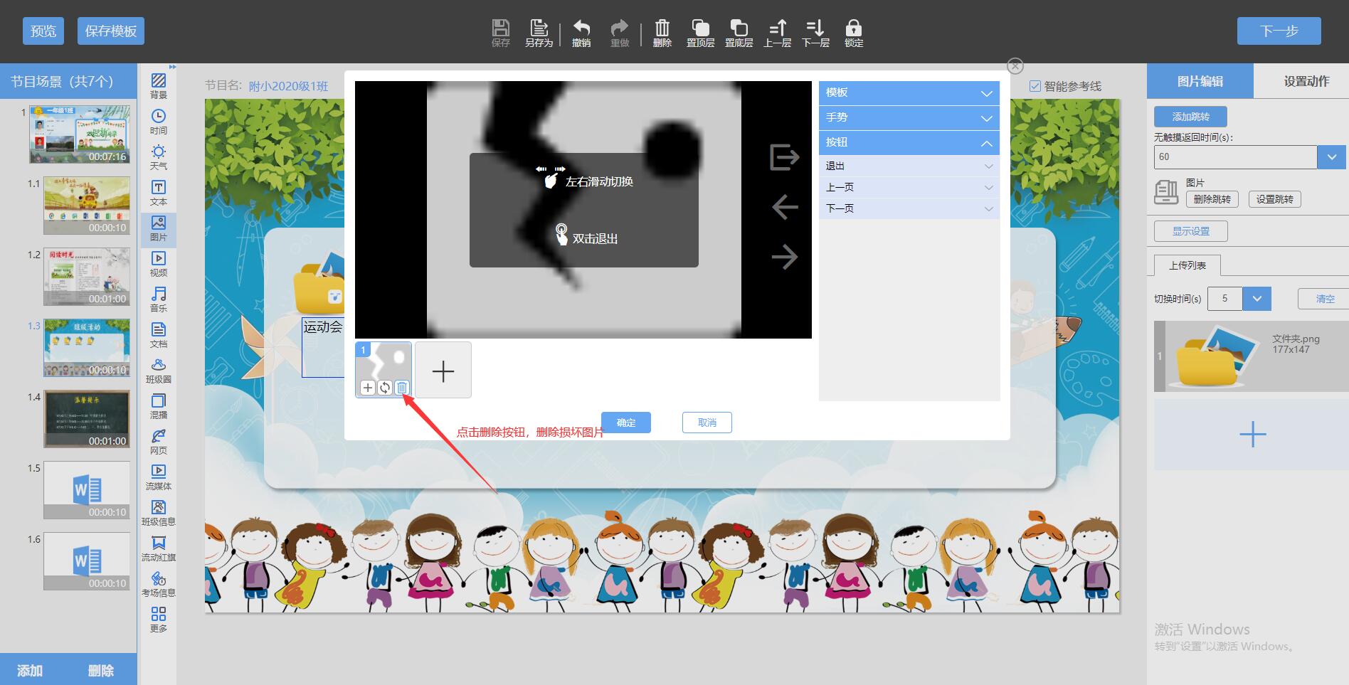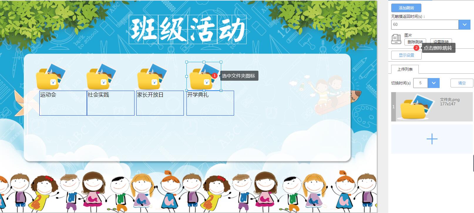 选择主场景,选中班级介绍(班级荣誉)图标,删除跳转或者点击设置跳转图标,添加图片。