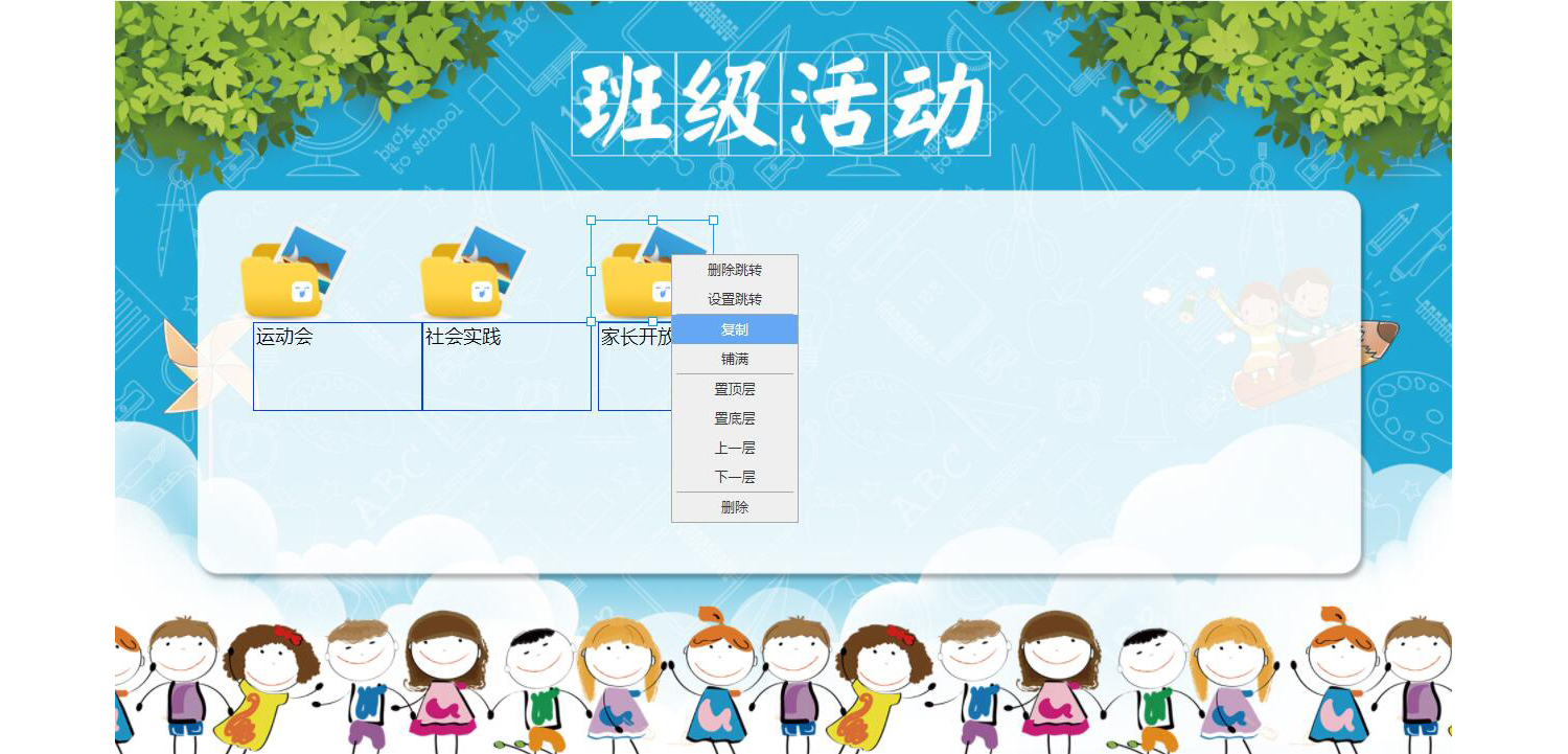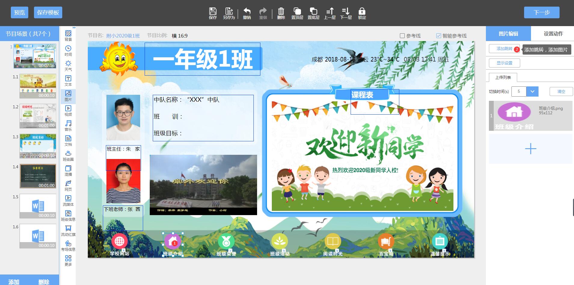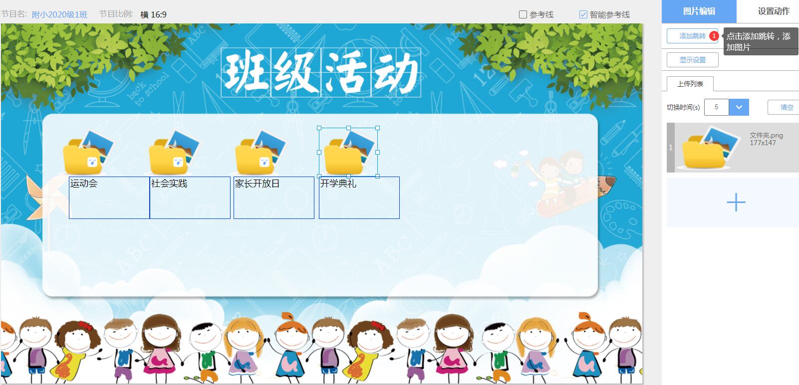 选择主场景,选中班级介绍(班级荣誉)图标,删除跳转或者点击设置跳转图标,添加图片。