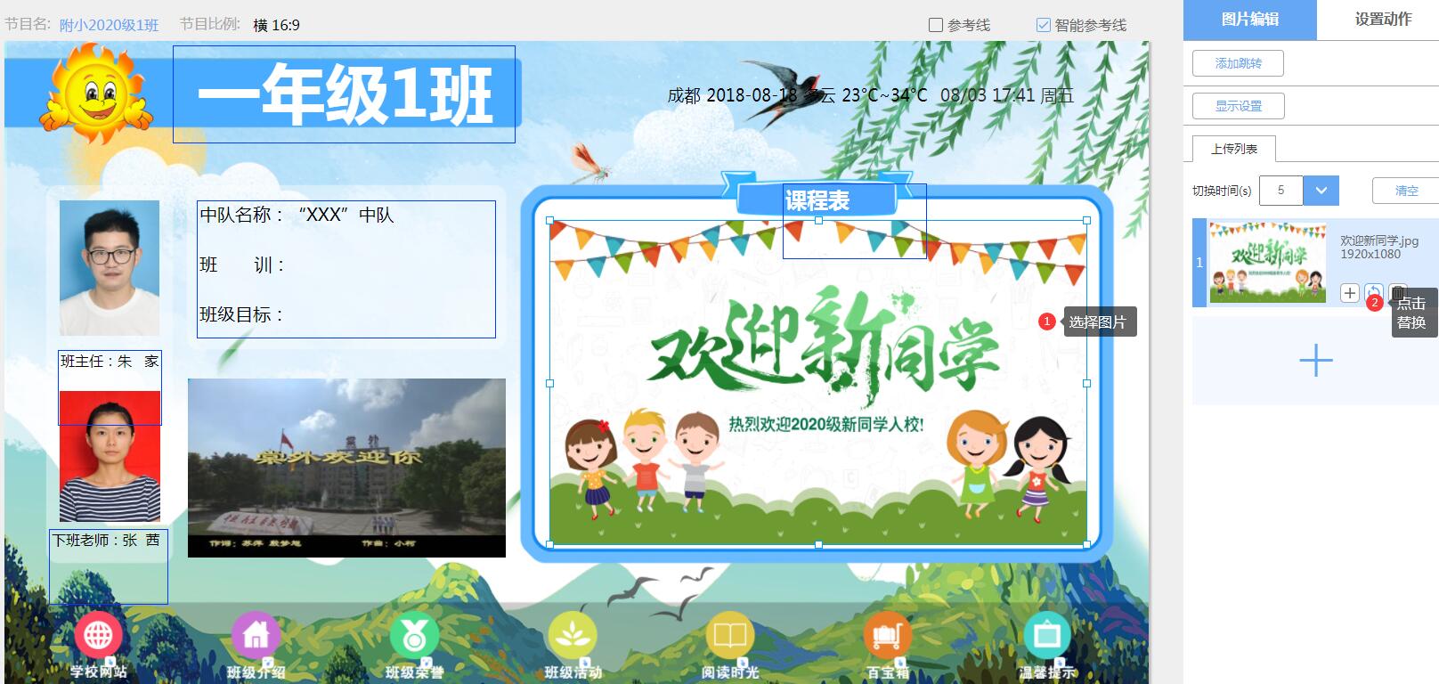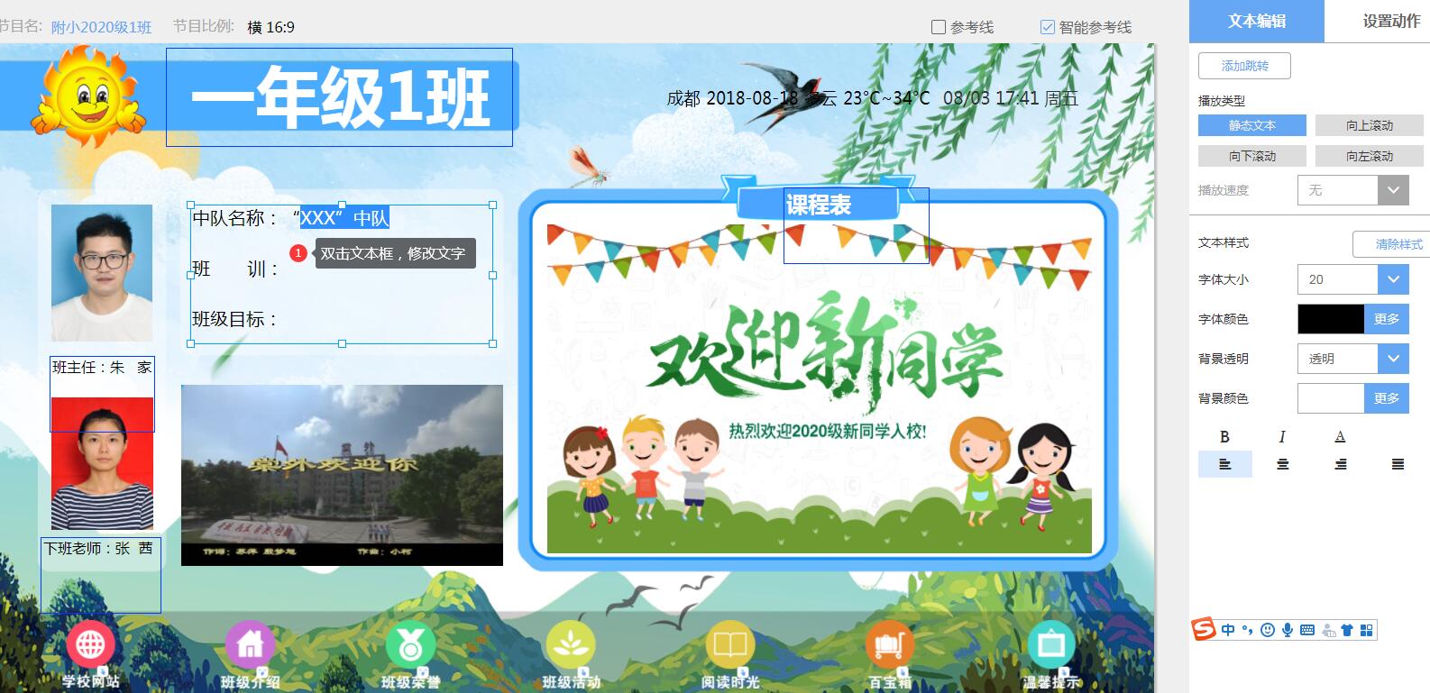 修改节目首页内容 班级名称,班训,班级格言,班主任、班长信息,课表(需在PPT模板中制作),轮播视频和图片