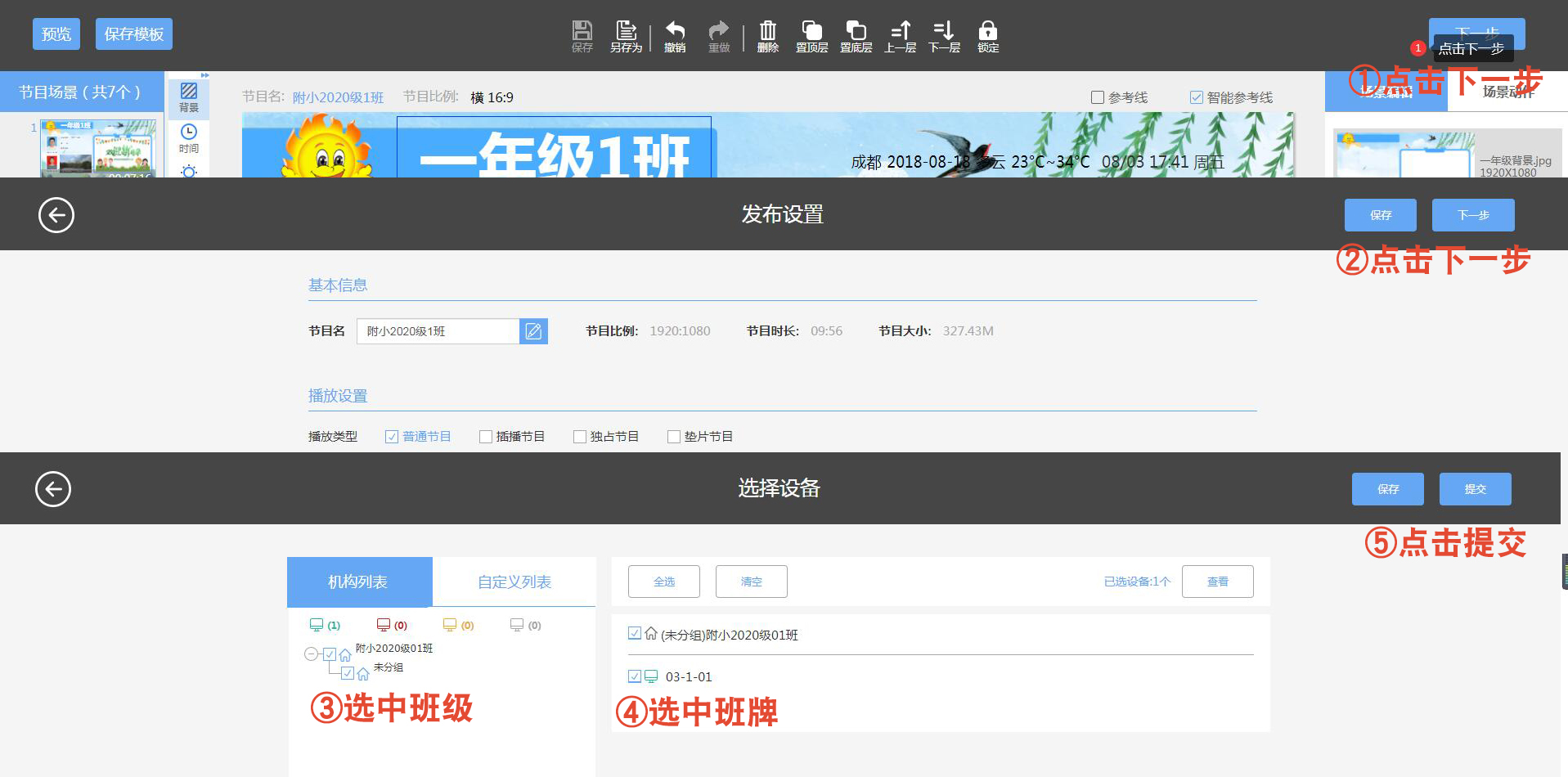 在节目编辑页面,点击右上角下一步按钮,在弹出的发布设置页面点击下一步,在弹出的选择设备页面选中班级、选中班牌、点击提交按钮发布节目。
