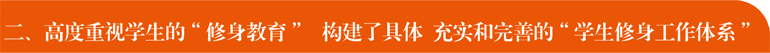 幼儿园、小学、初中、高中形成了循序渐进的德育系统,对不同年龄阶段的学生提出不同的具体要求:幼儿园要求“养善益智”,小学要求“明礼行孝”、初中要求“厚德持义”,高中要求“育贤培元”。这个完整的体系帮助学生树立良好的道德品格,养成良好的行为习惯。