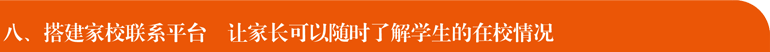 学校在校园网上设置“家校通”栏目,家长可以通过校园网随时查看学生的考试成绩、在校表现、出入校门刷卡记录、食堂消费记录等等,有助于家长详细掌握学生在校情况。